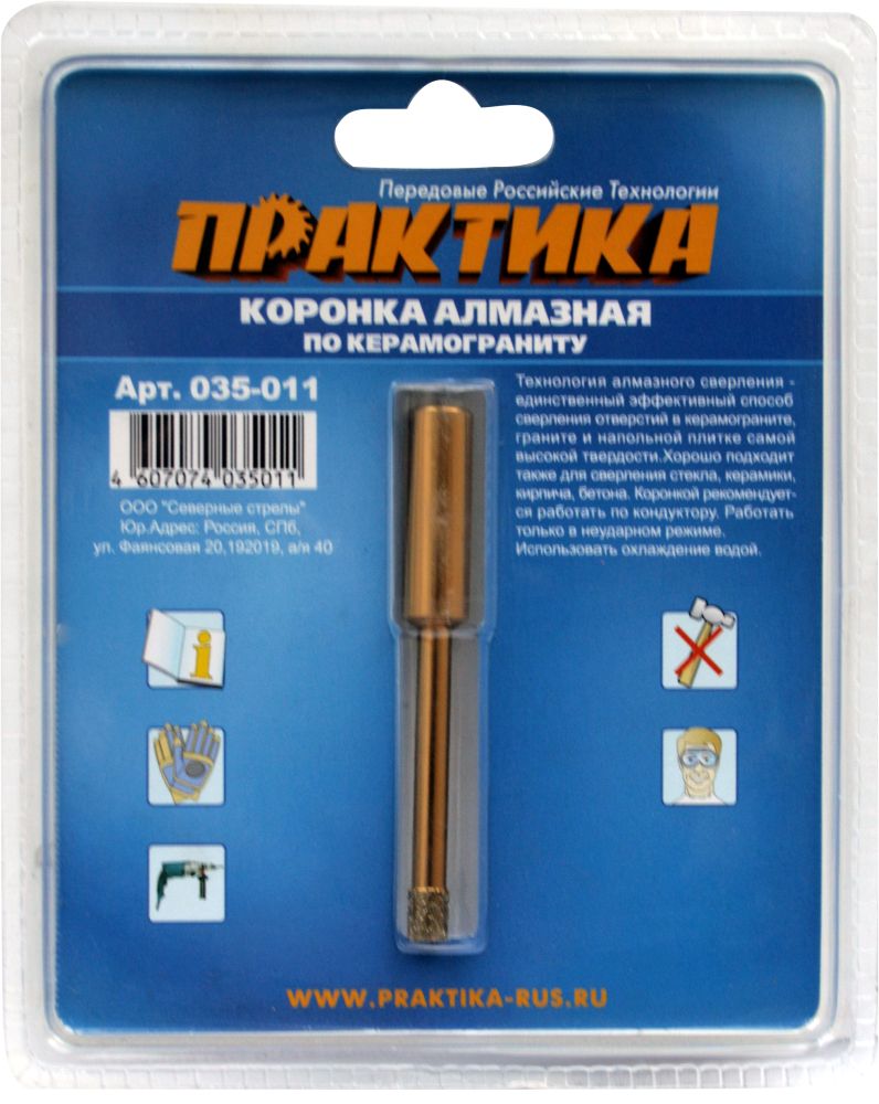 ПРАКТИКА 035-011 - кольцевая коронка для дрелей. Используется при проделывании отверстий в кафеле, керамограните, камне, стекле. Корпус изготовлен из высокопрочной стали, а режущая кромка имеет алмазное напыление.
