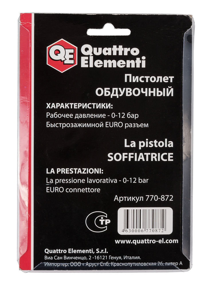 Обдувочный пистолет QUATTRO ELEMENTI 770-872 - удобный, практичный инструмент для удаления грязи с различных поверхностей. Металлический корпус гарантирует долгий срок службы. Принцип работы на сжатом воздухе предусматривает низкую пожаро- и взрывоопасность рабочего процесса. Благодаря отверстию в корпусе, пистолет можно удобно хранить в подвешенном состоянии.