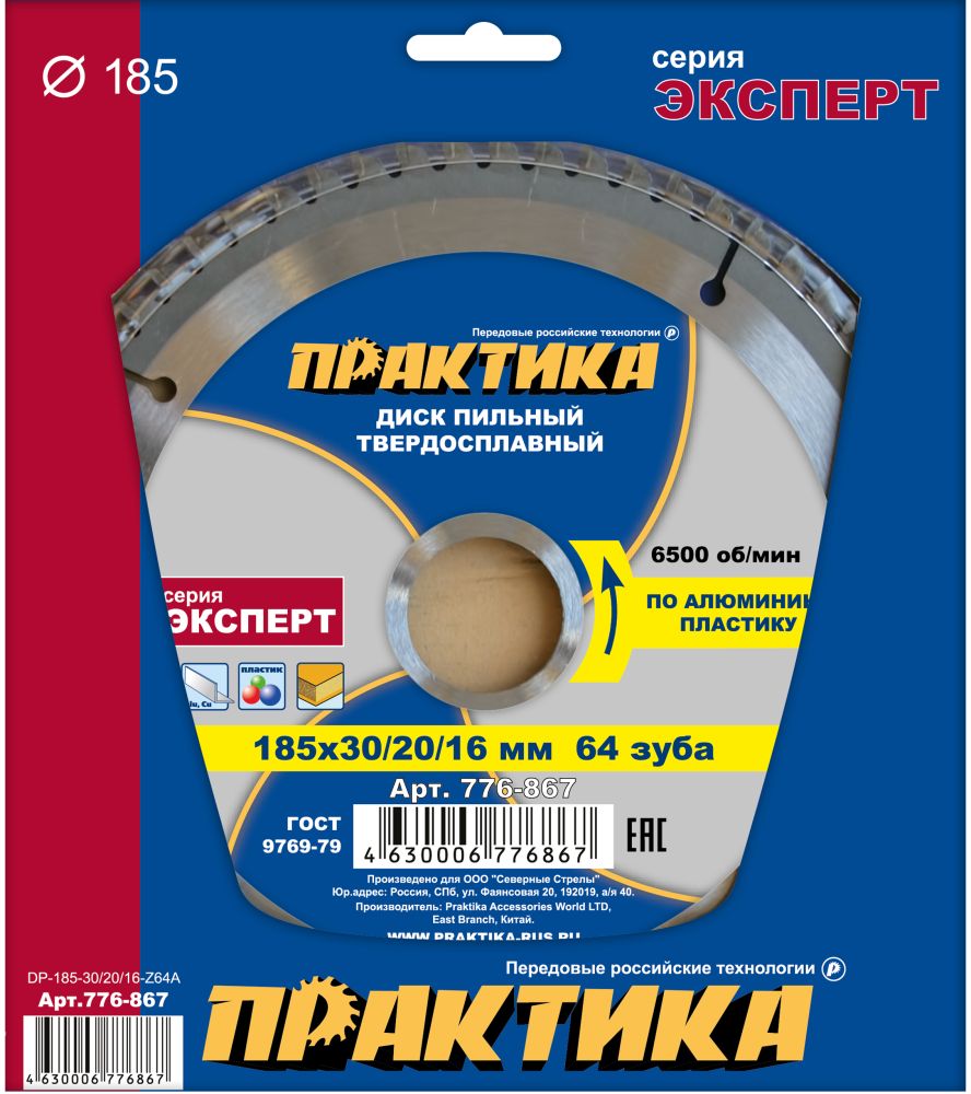 Диск пильный твёрдосплавный по алюминию ПРАКТИКА 185 х 30/20/16 мм, 64 зуба (185х30/20/16мм, 64зуба) арт. 776-867 | код 30043
