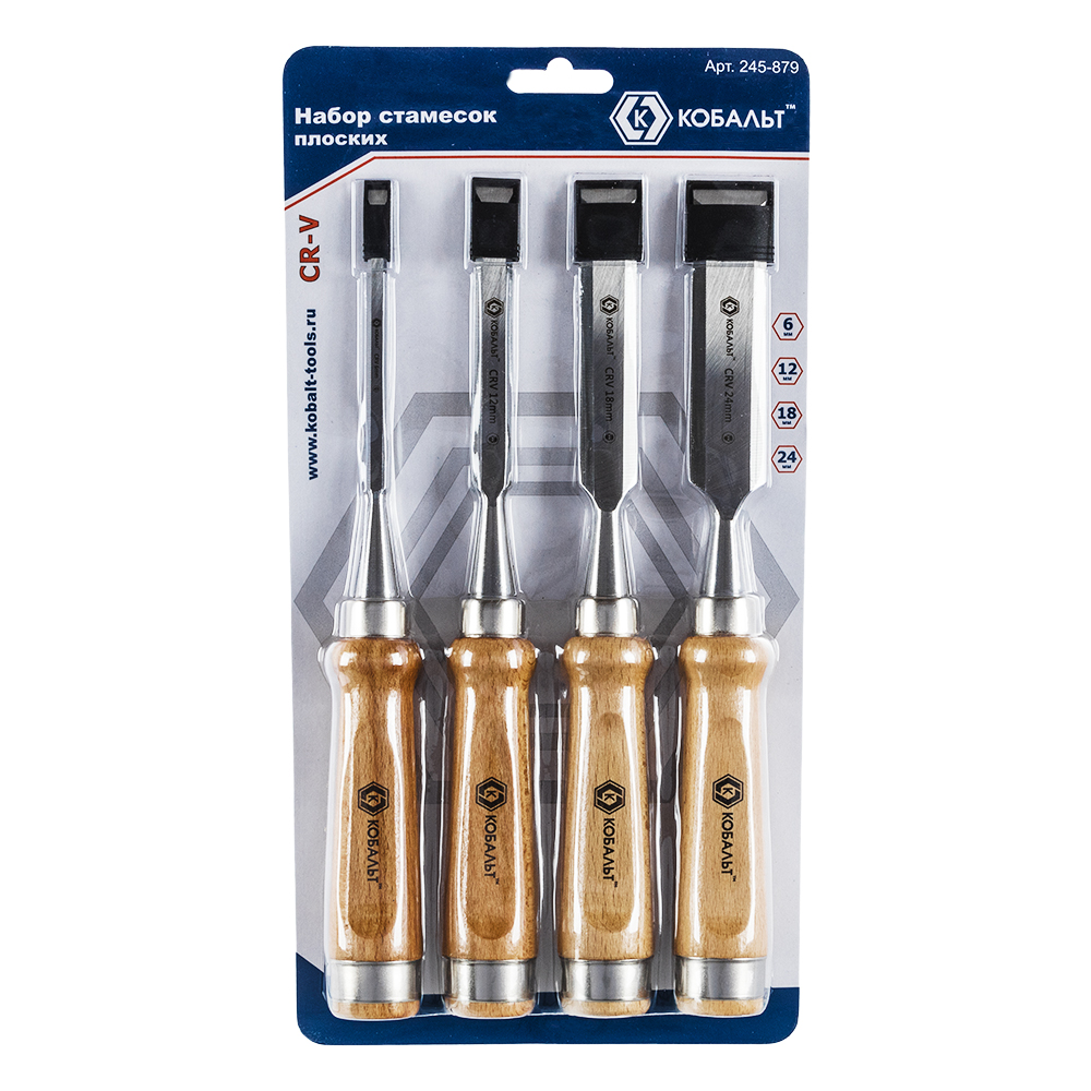Набор стамесок КОБАЛЬТ плоских: 6, 12, 18, 24 х 140 мм,CR-V, деревянная рукоятка (4 шт.) блистер (4 шт., блистер) арт. 245-879 | код 427092