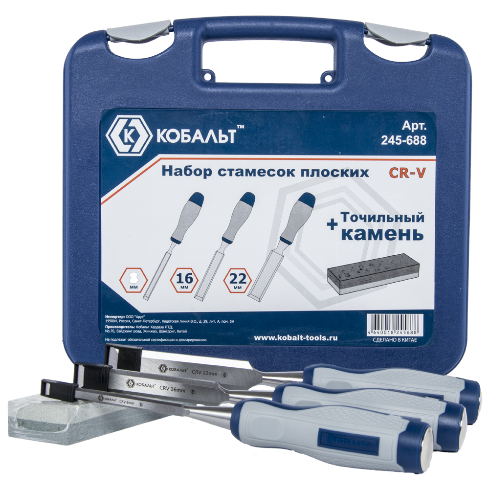 Набор плоских стамесок: 8, 16, 22мм, длина 140мм, CR-V, двухкомпонентные рукоятки, точильный камень, 3шт, кейс КОБАЛЬТ 245-688 - комплект прочных, надежных и долговечных деревообрабатывающих инструментов с удобными двухкомпонентными ручками. Рабочие части стамесок изготовлены из высокопрочной хром-ванадиевой стали, режущие кромки острозаточены и надолго сохраняют свои качества.