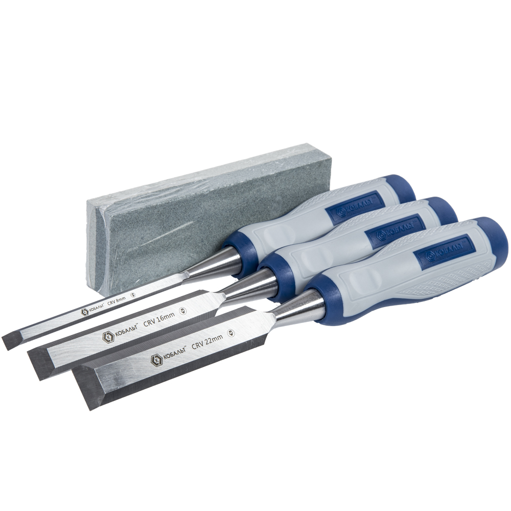 Набор стамесок КОБАЛЬТ плоских: 8, 16, 22 х 140 мм,CR-V, двухкомпонентная рукоятка, точильн. камень (3 шт.) кейс (3 шт., кейс) арт. 245-688 | код 427095