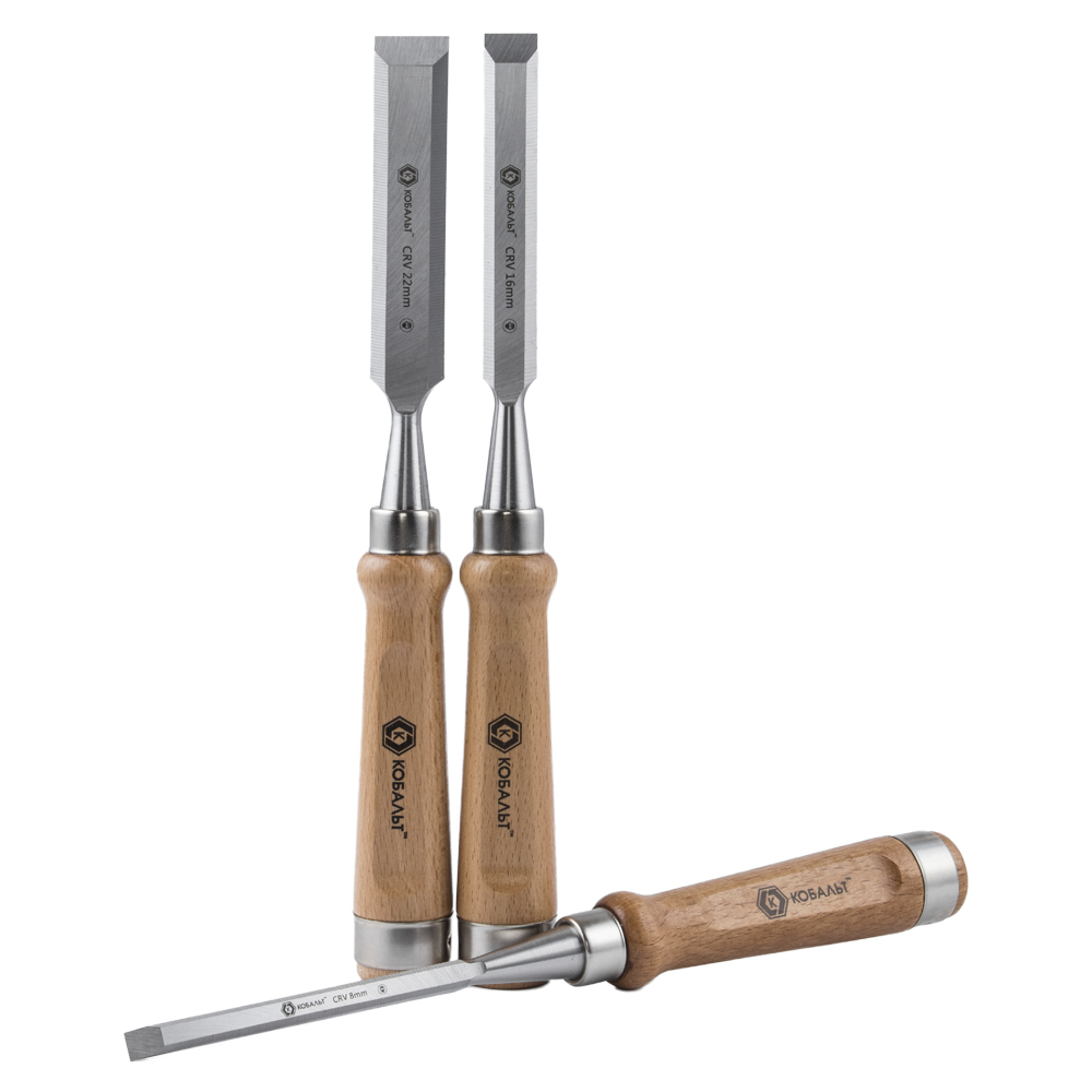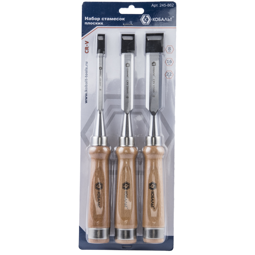 Набор стамесок КОБАЛЬТ плоских: 8, 16, 22 х 140 мм,CR-V, деревянная рукоятка (3 шт.) блистер (3 шт., блистер) арт. 245-862 | код 427096