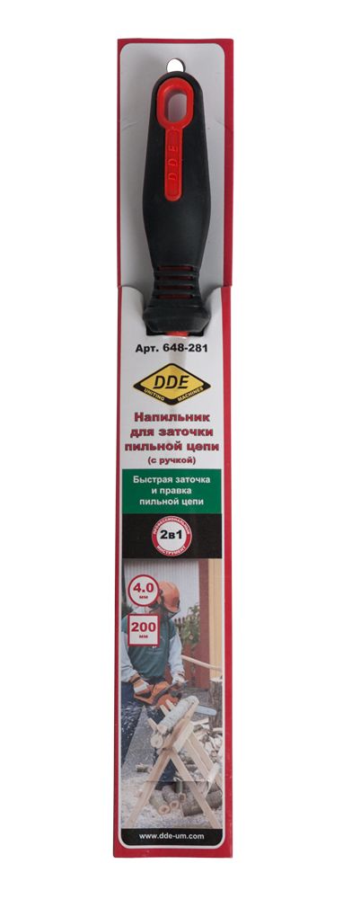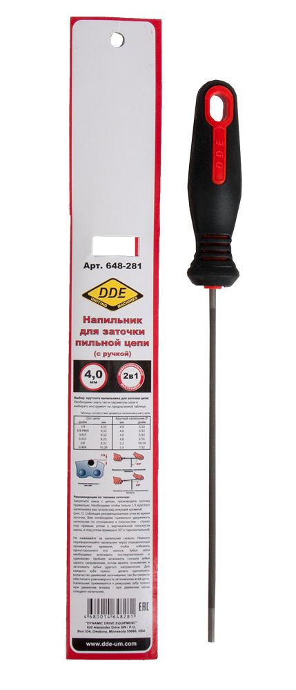 Напильник круглый 4,0 мм - 5/32 DDE 648-281 используется при заточке и правке пильных цепей, не снимая их с бензопилы. Напильник подходит для заточки цепей с шагом 1/4", 3/8 PMN, 3/8 P. Пластиковая ручка удобно лежит в руке.