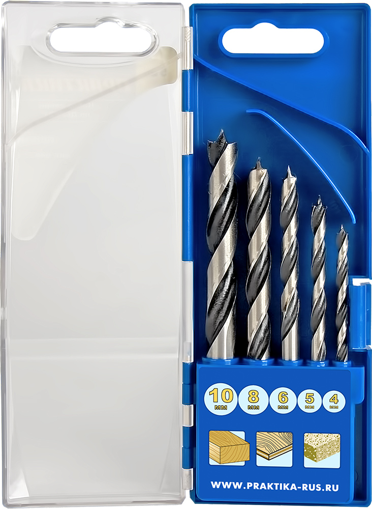 Набор сверл по дереву ПРАКТИКА "Профи", 5 шт, 4, 5, 6, 8, 10 мм, ПРО кассета4, 5, 6, 8, 10 мм, ПРО кассета арт. 640-353 | код 428246