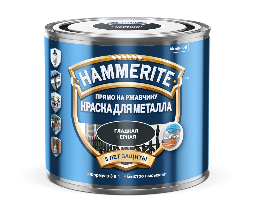 Благодаря технологии Dual Tech c добавлением воска, Hammerite обеспечивает двойную защиту металлической поверхности от воды и коррозии до 8 лет. Образует износостойкое и эластичное покрытие, устойчивое к перепадам влажности и температурам внутри и снаружи помещений. Hammerite обладает чешуйчатой структурой, служащей дополнительным барьером на пути кислорода и воды к металлической поверхности.