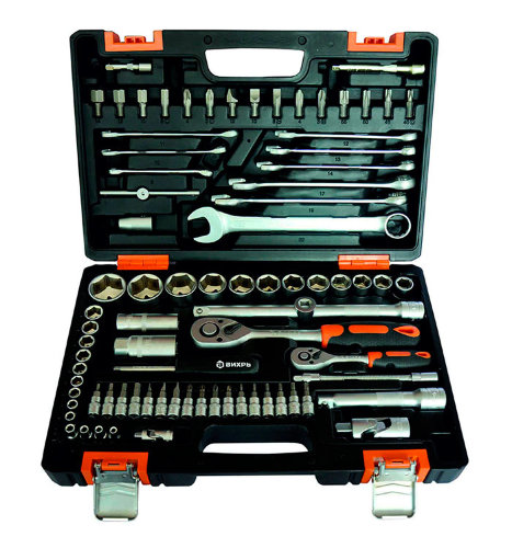 Набор инструментов ВИХРЬ - набор из 82 инструментов в кейсе. В комплект входят рукоять для бит, трещотка, ключи гаечные. Также в комплектацию входит оснастка (биты, торцевые головки) и аксессуары (гибкий удлинитель для головок, удлинитель для головок, шарнир карданный для головок, кейс).