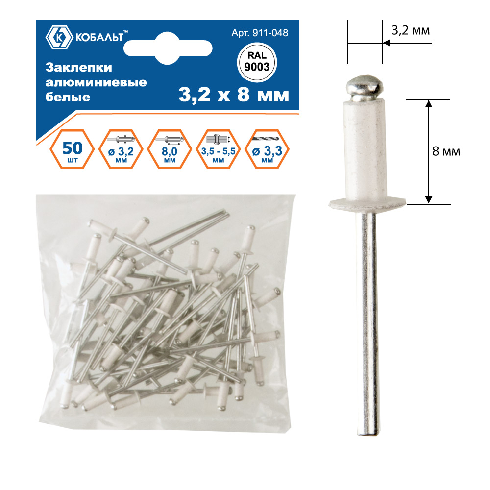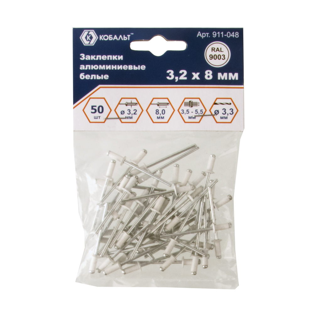 Заклепки КОБАЛЬТ алюминиевые, 3,2 х 8 мм, белые RAL 9003 (50 шт.) пакет арт. 911-048 | код 725533