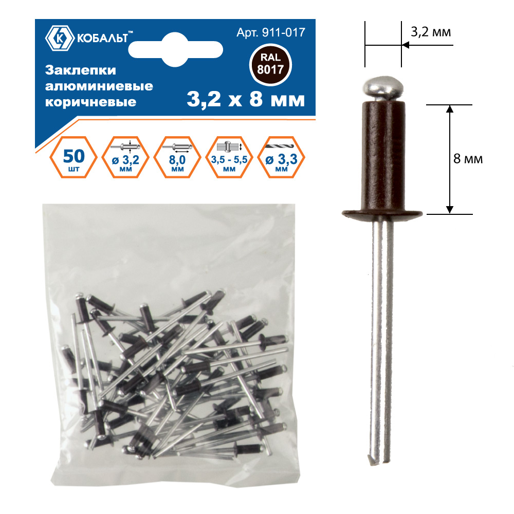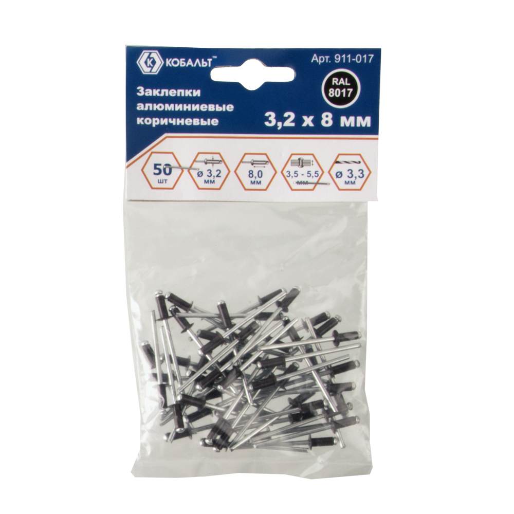 Заклепки КОБАЛЬТ алюминиевые, 3,2 х 8 мм, коричневые RAL 8017 (50 шт.) пакет арт. 911-017 | код 725535