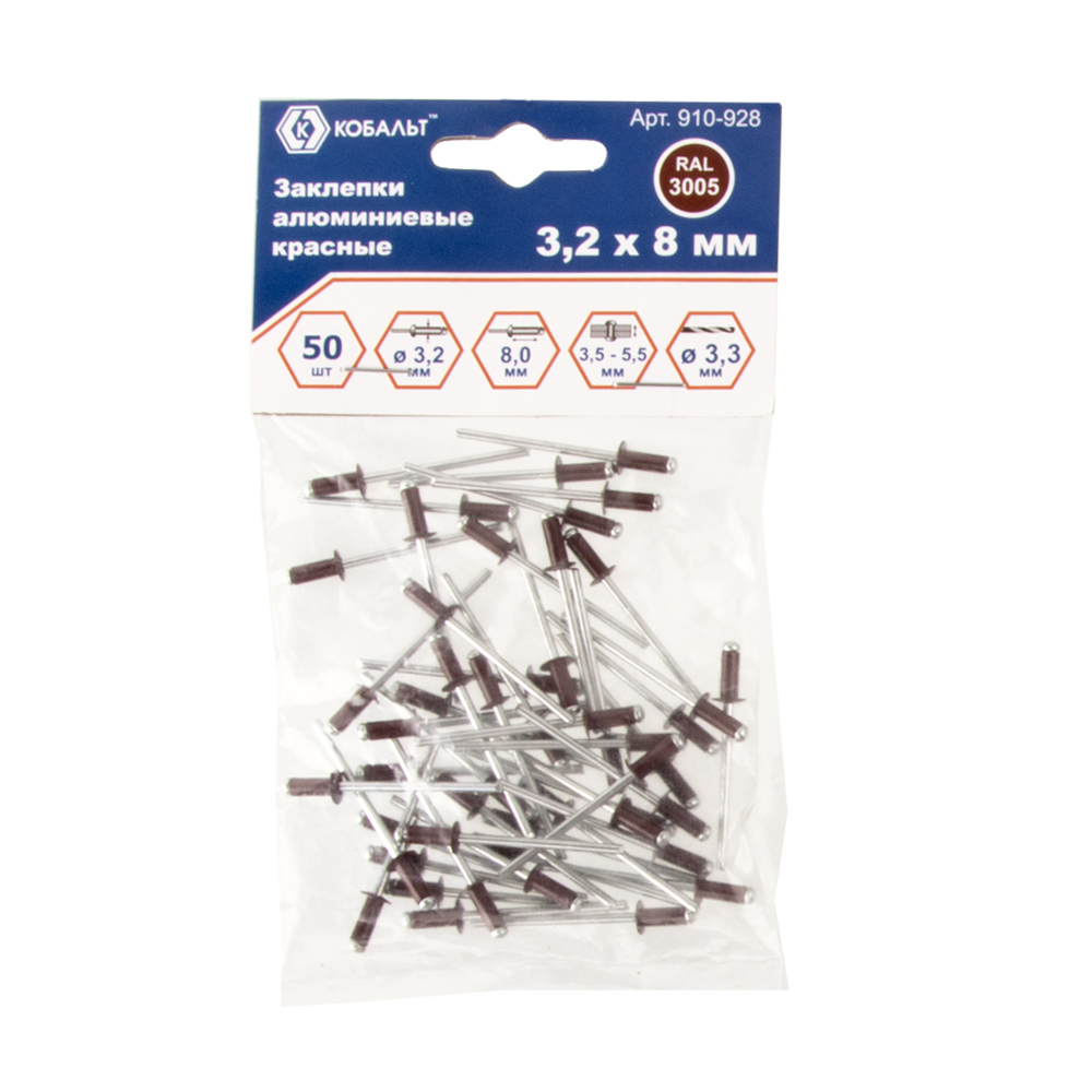 Заклепки КОБАЛЬТ алюминиевые, 3,2 х 8 мм, красные RAL 3005 (50 шт.) пакет арт. 910-928 | код 725536