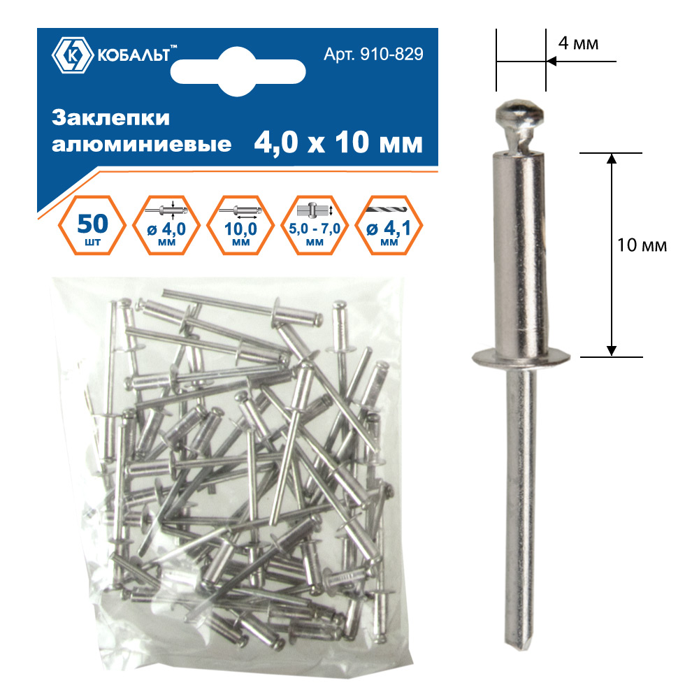 Заклепки КОБАЛЬТ алюминиевые, 4,0 х 10 мм (50 шт.) пакет арт. 910-829 | код 725538