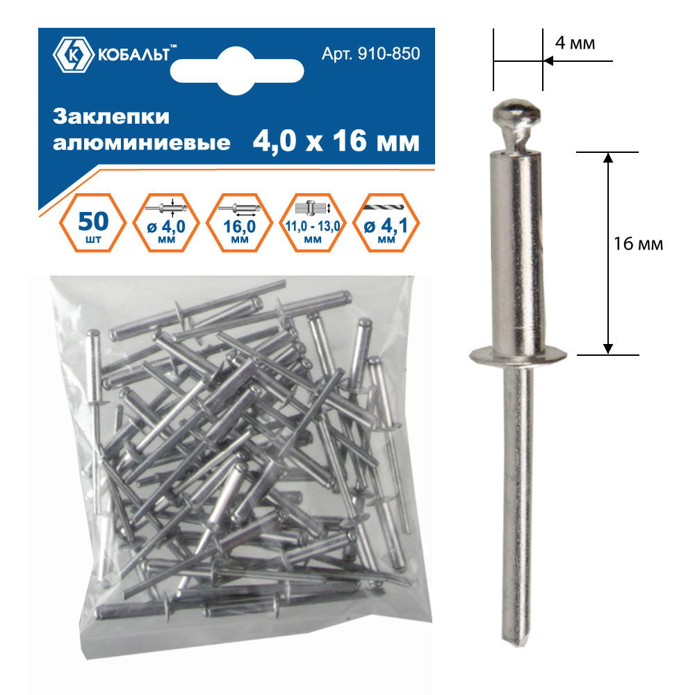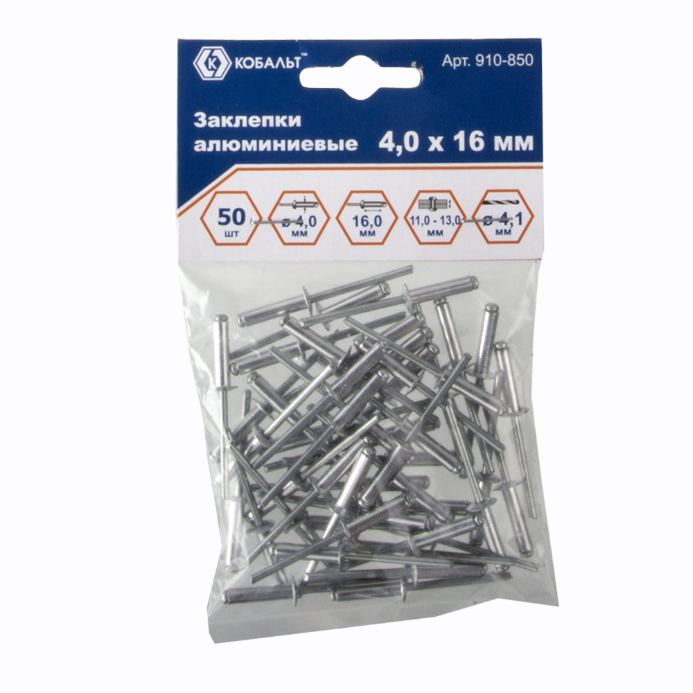 Заклепки КОБАЛЬТ алюминиевые, 4,0 х 16 мм (50 шт.) пакет арт. 910-850 | код 725546