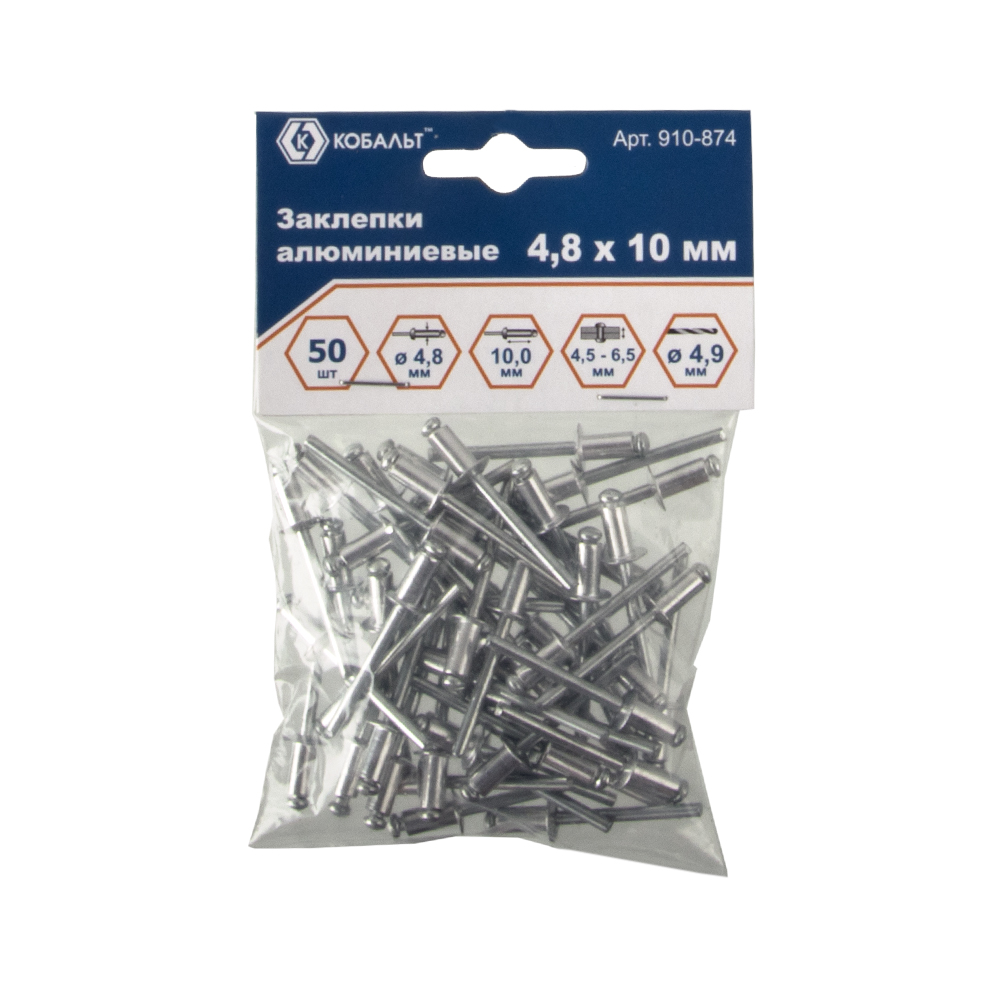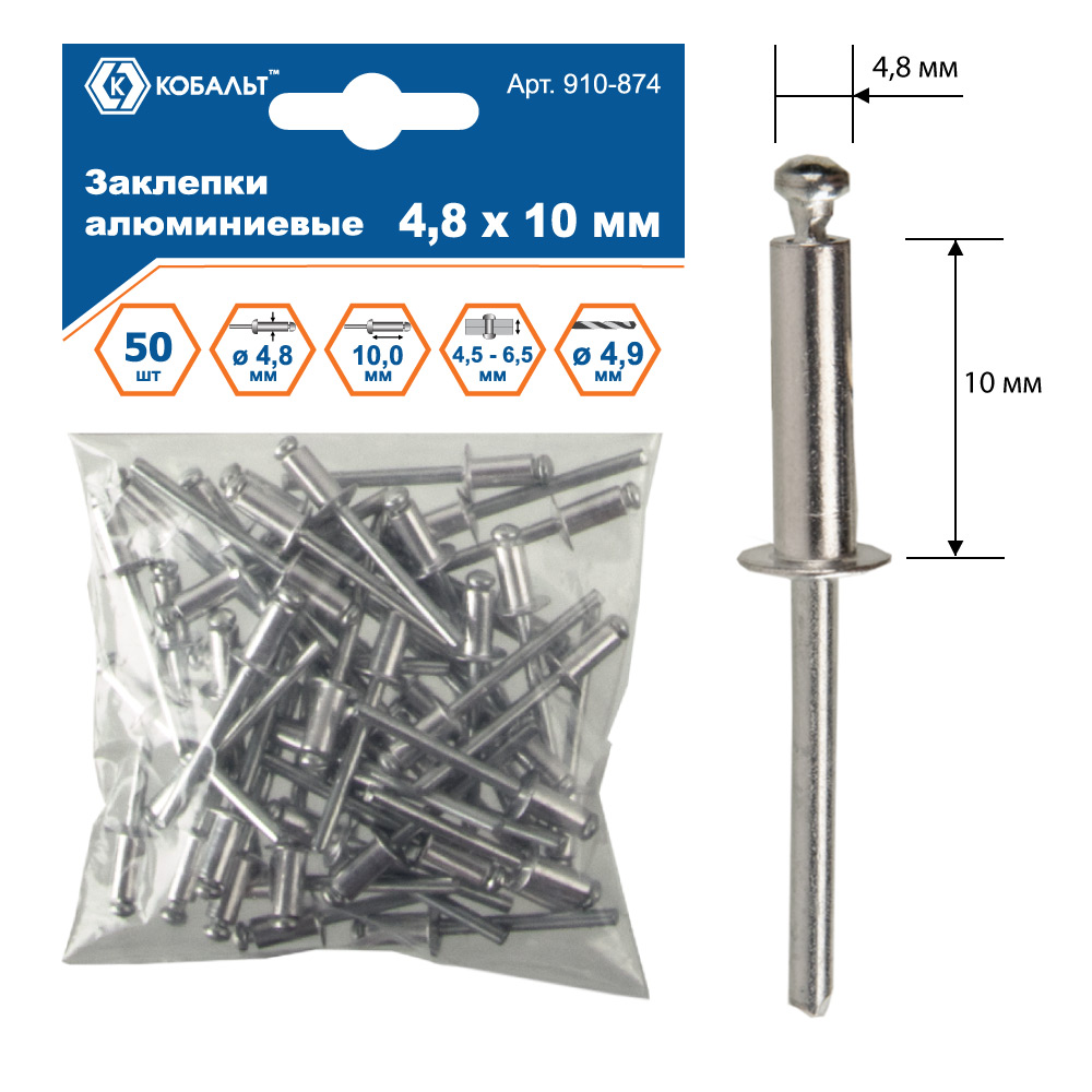 Заклепки КОБАЛЬТ алюминиевые, 4,8 х 10 мм (50 шт.) пакет арт. 910-874 | код 725549