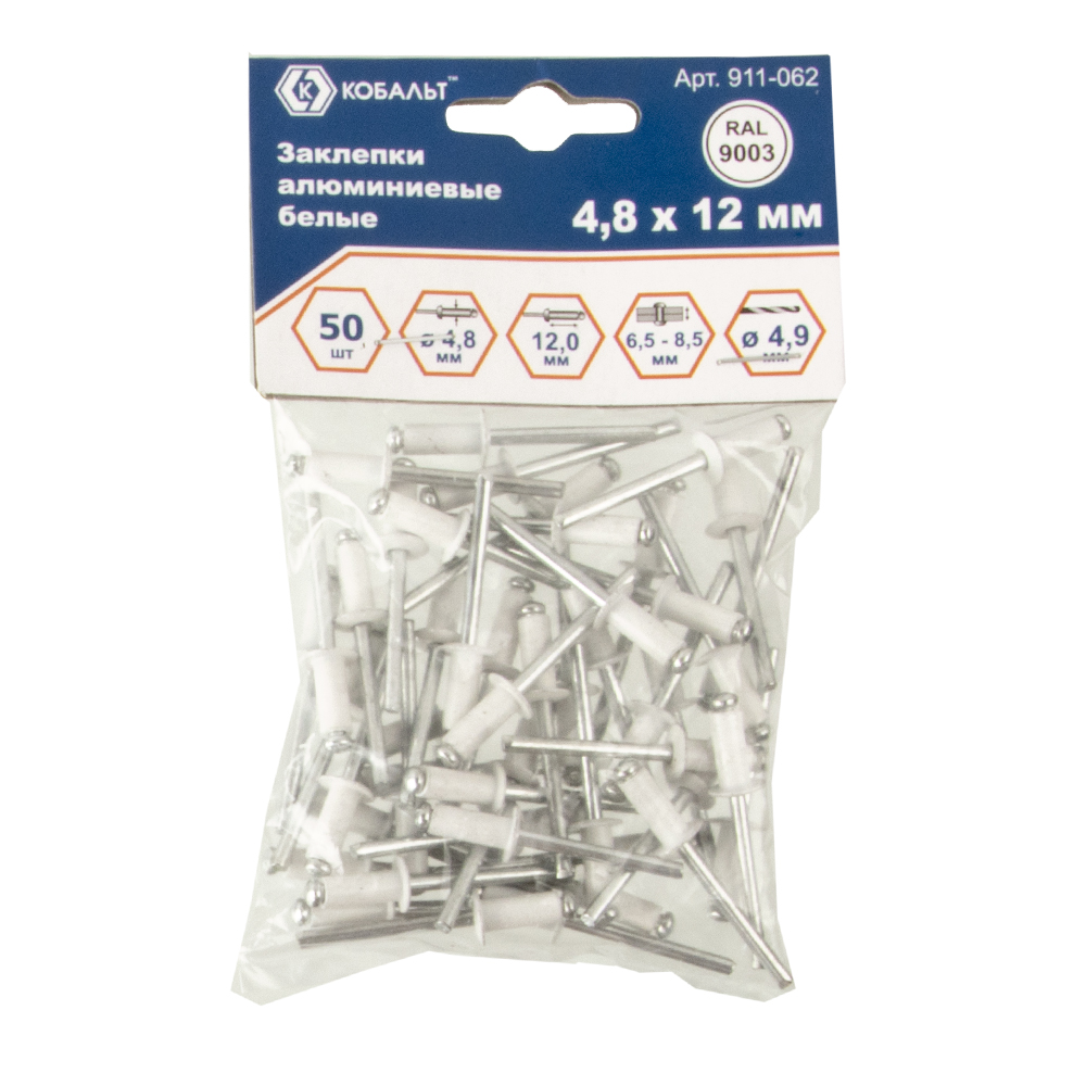 Заклепки КОБАЛЬТ алюминиевые, 4,8 х 12 мм, белые RAL 9003 (50 шт.) пакет арт. 911-062 | код 725551