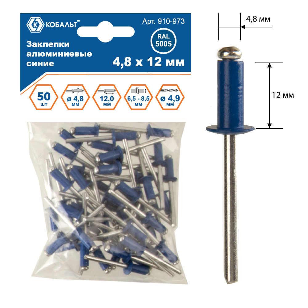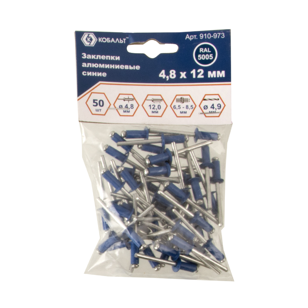 Заклепки КОБАЛЬТ алюминиевые, 4,8 х 12 мм, синие RAL 5005 (50 шт.) пакет