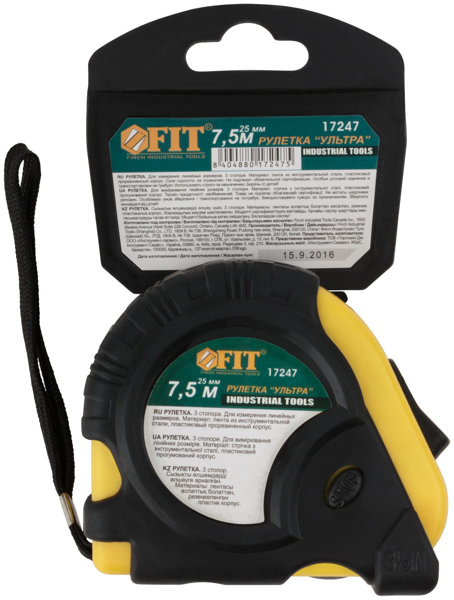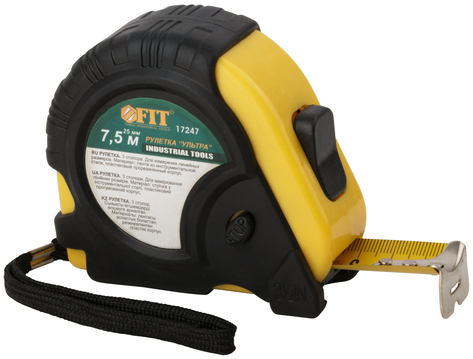 Рулетка прорезинен. корпус, тройной стопор "Ультра" 7,5 м x 25 мм FIT FINCH INDUSTRIAL TOOLS арт. 17247 | код 781048