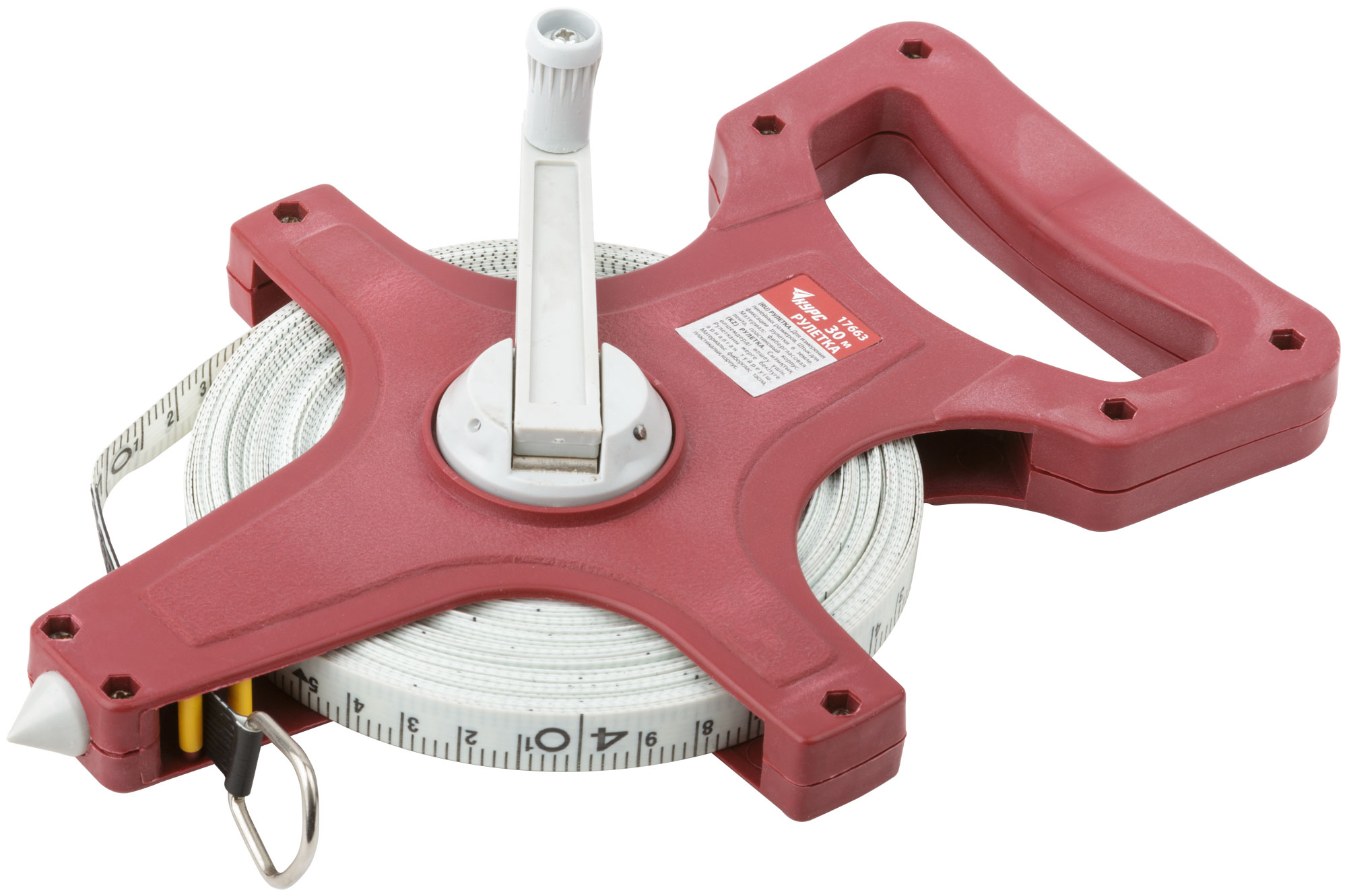 Со штыком для фиксации рулетки в земле при измерении больших длин. Материалы: фибергласовая лента, пластиковый корпус.