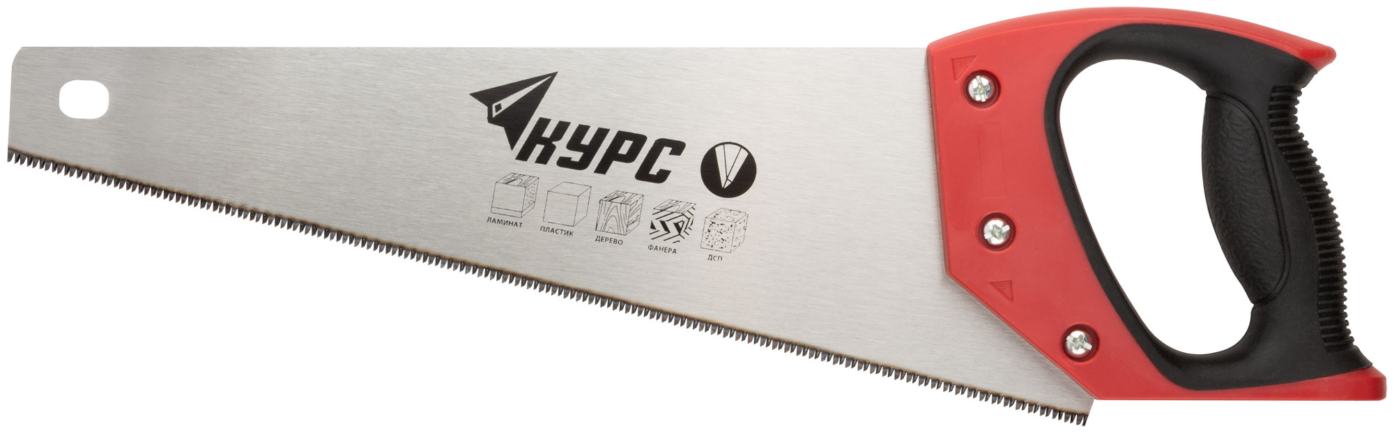 Ножовка по дереву, мелкий каленый зуб 12 ТPI, 3D заточка, пласт.прорезиненная ручка 350 мм КУРС