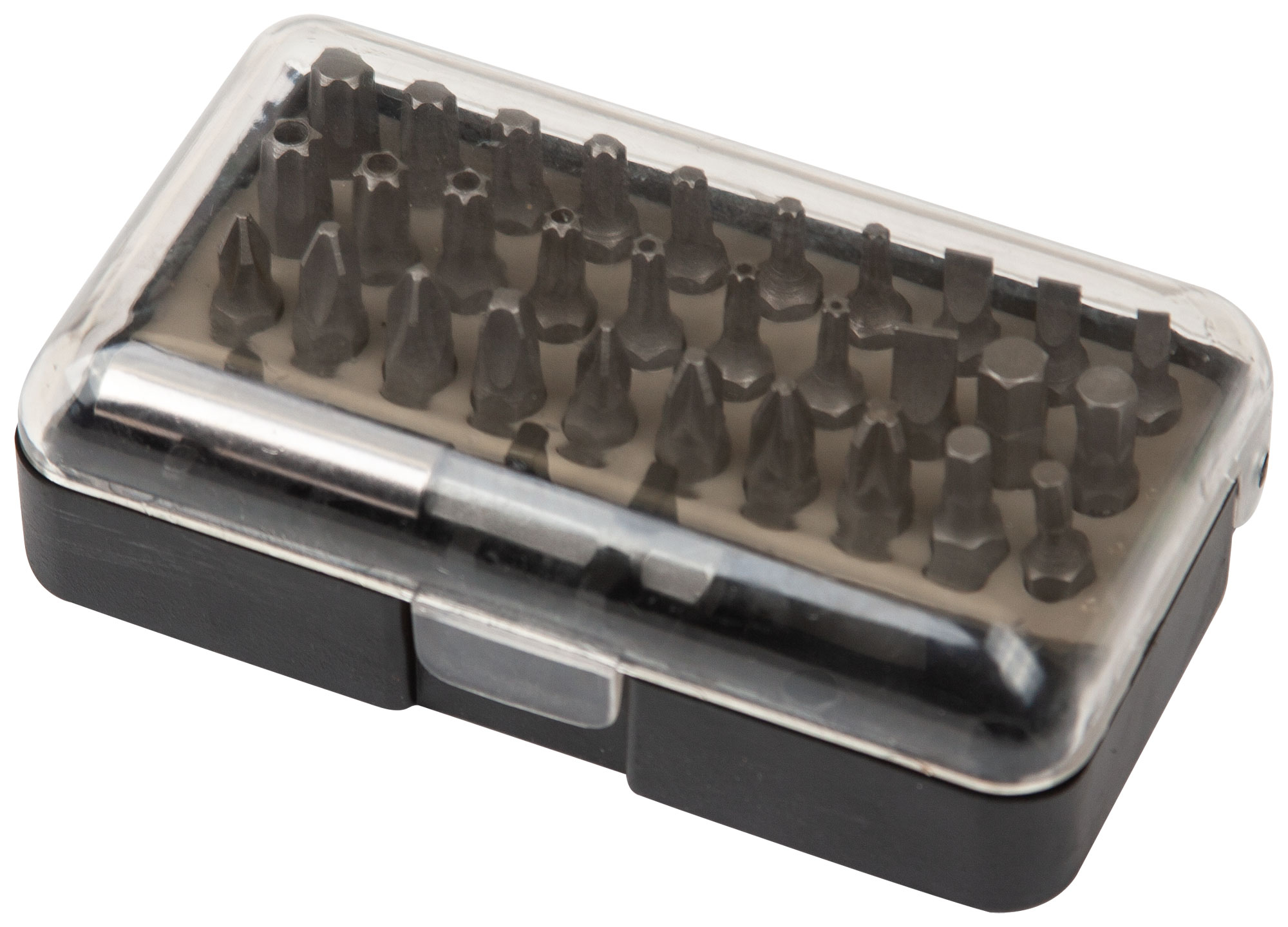 В наборе: 30 бит из хром-ванадиевой стали + адаптер для бит с надежным захватом. Биты: PH1; PH2; PH2; PH3; PZ1; PZ2; PZ2; PZ3; SL3; SL4; SL5; SL6; H3; H4; H5; H6; T10; T15; T20; T25; T27; T30; T40; «TORX» с отверстием: T10; T15; T20; T25; T27; T30; T40.