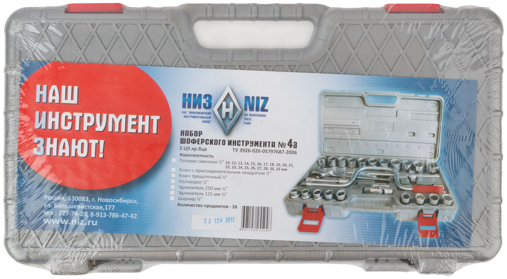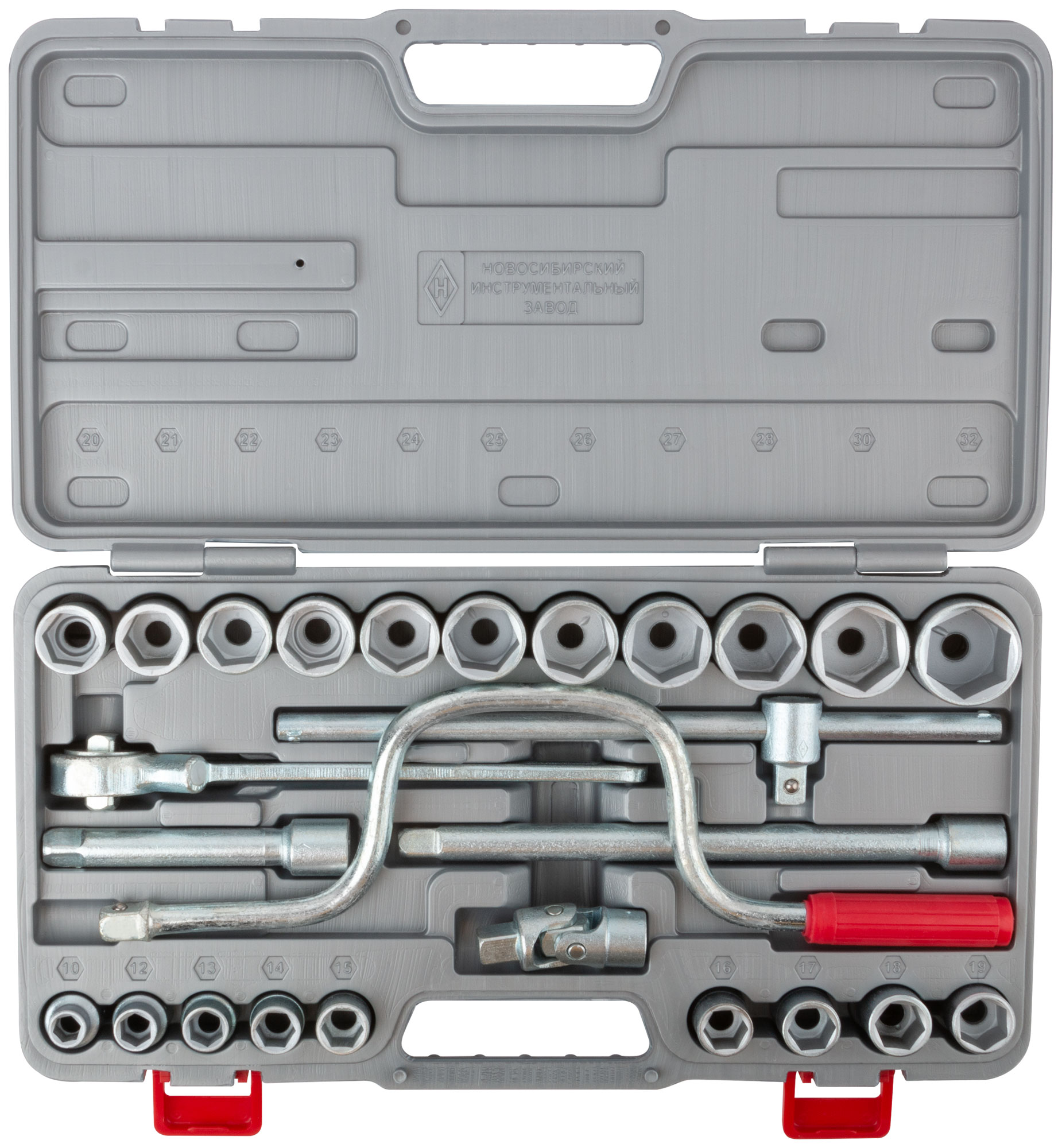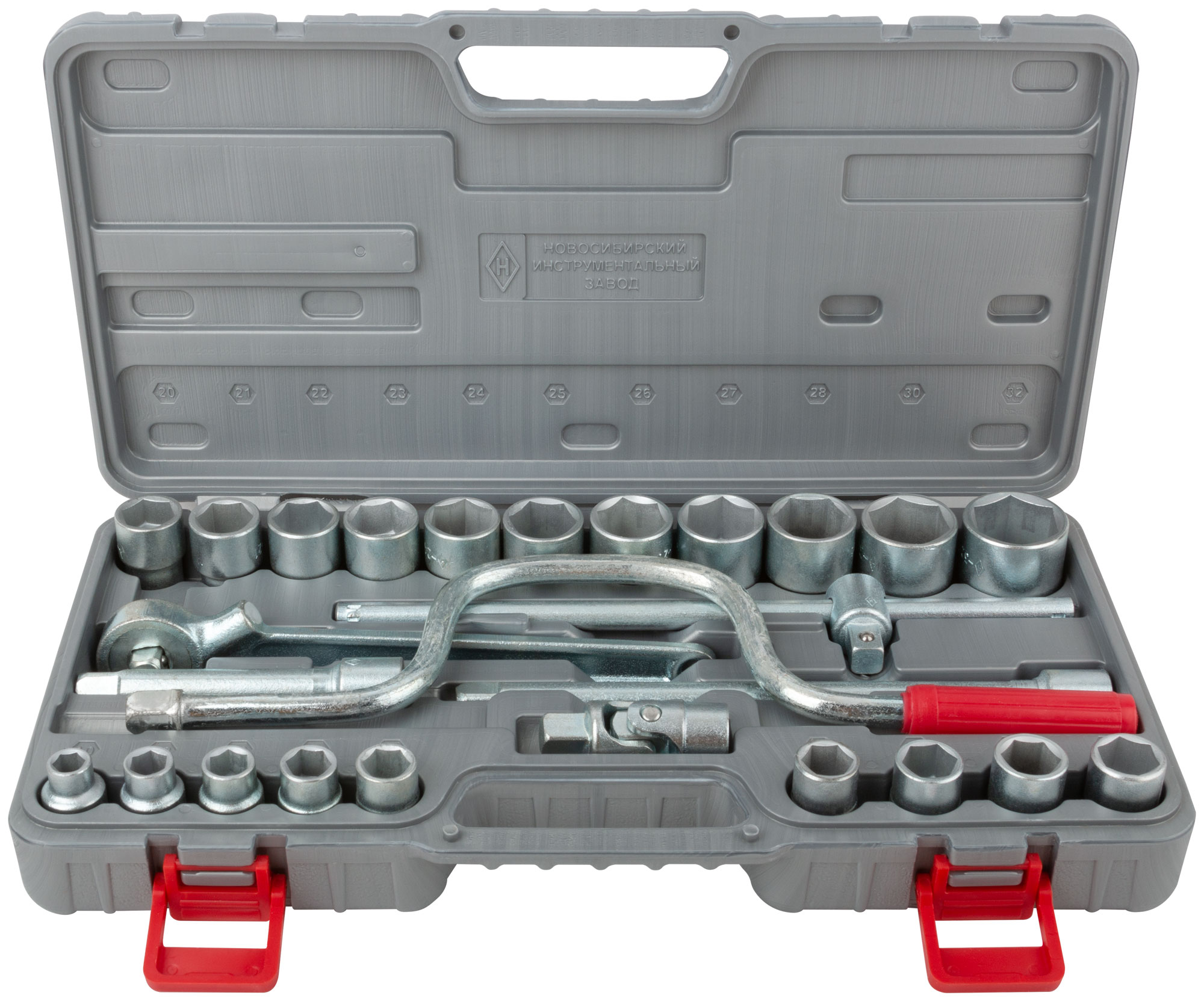 «Всё для автомобиля». Комплектация: вороток трещоточый 1/2” х 250 мм, переходник шарнирный 1/2”, вороток-рычаг с присоединительным квадратом 1/2”, удлинитель 1/2”x125 мм , удлинитель 1/2”x250 мм , головки шестигранные 1/2” 10-12-13-14-15-16-17-18-19-20-21-22-23-24-25-26-27-28-30-32 мм. Материал: износоустойчивая конструкционная легированная сталь. Упаковка: пластиковый чемодан.