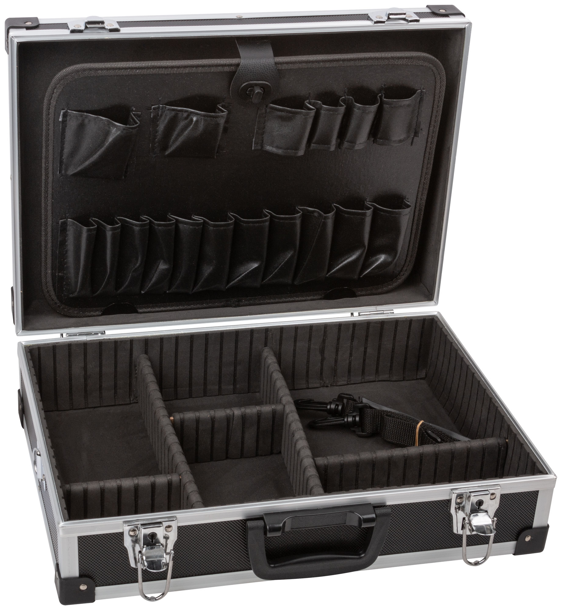 Алюминиевый. Внутренние перегородки – переставные. Отделка из мягкого пористого материала для более бережного хранения инструмента.