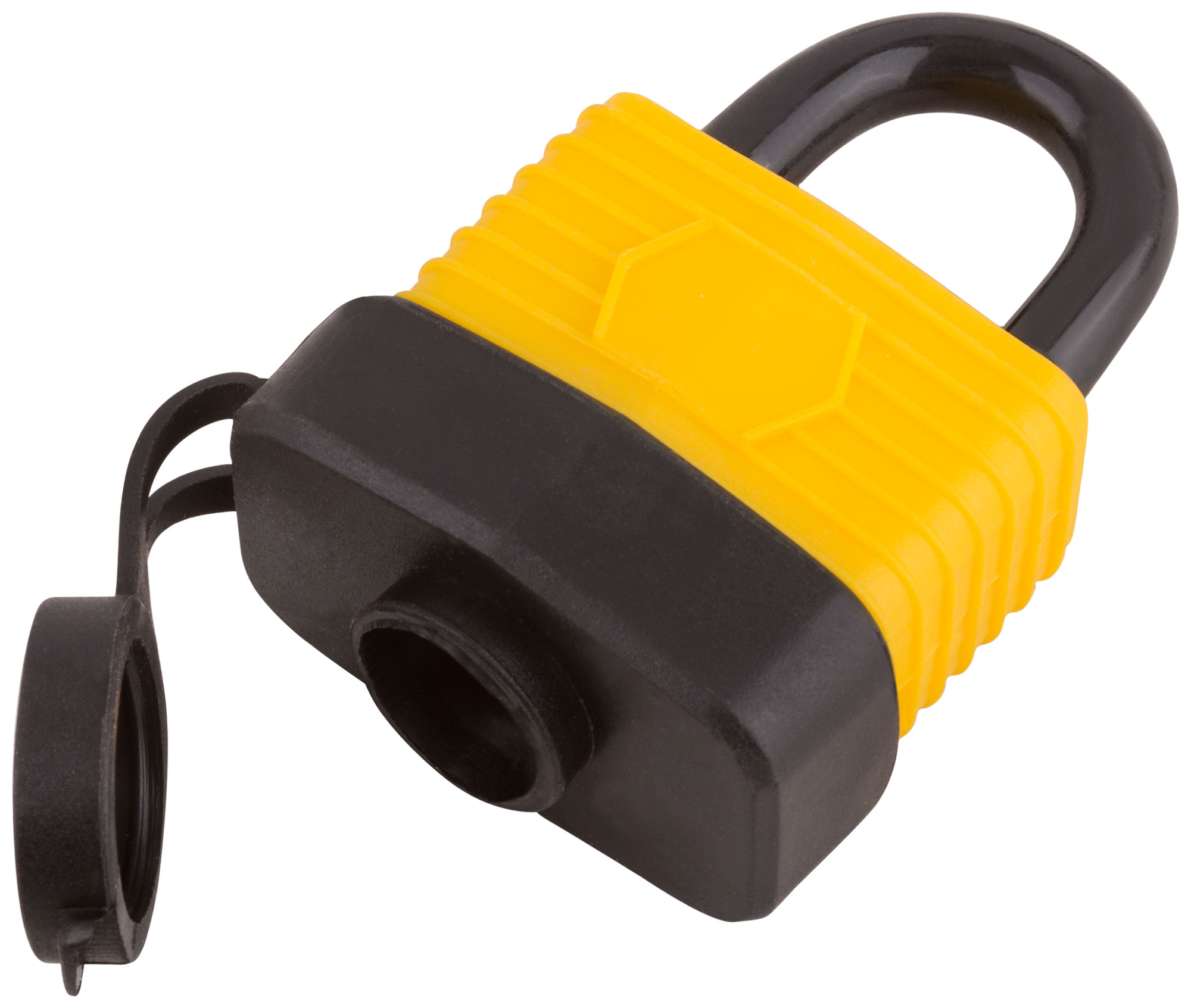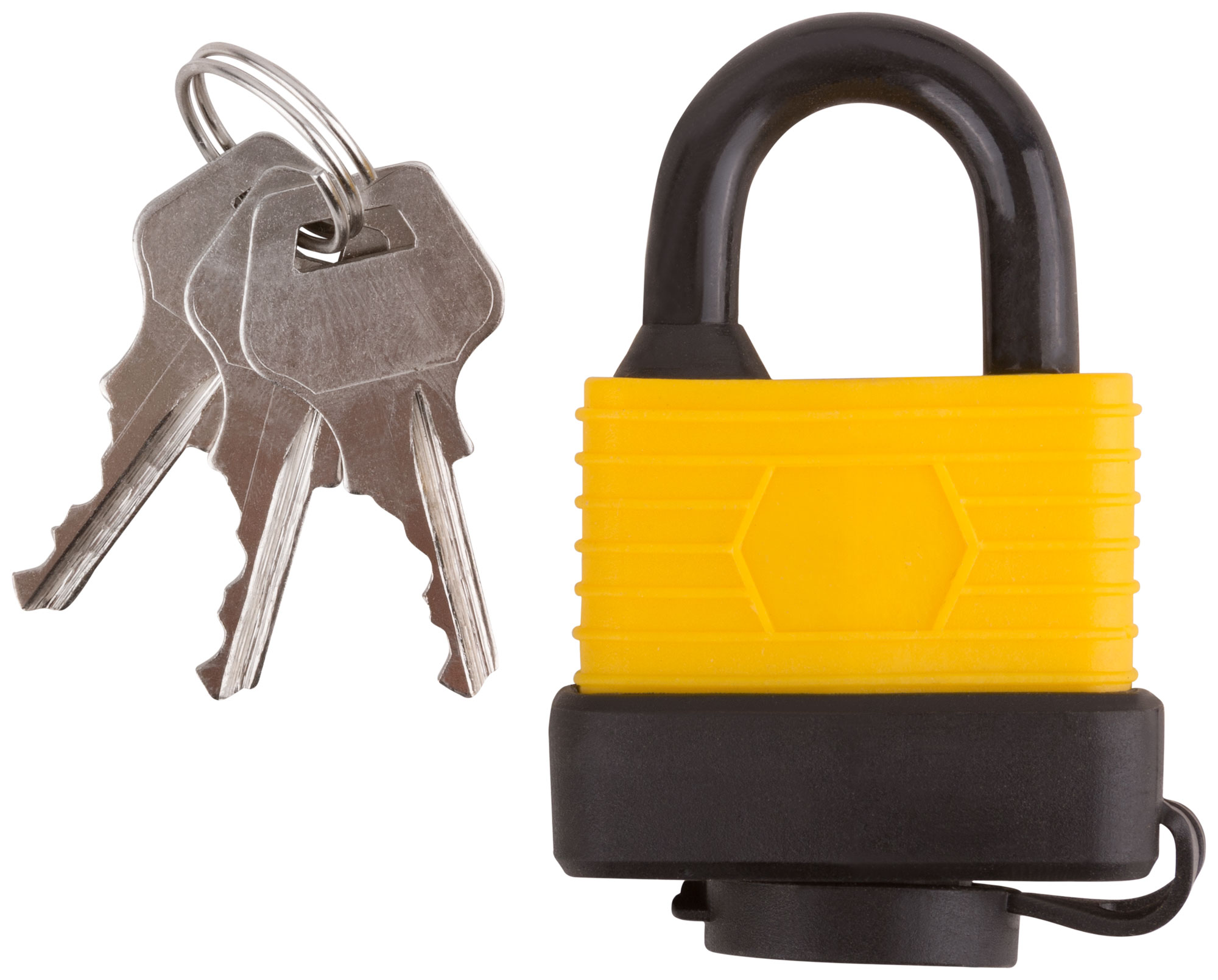 Всепогодный. Автоматическое запирание. Материал: инструментальная сталь, пластик.3 ключа. Пластиковый чехол на корпусе и специальная заглушка отверстия для ключа предохраняет замок от ржавчины. Упаковка: блистер.