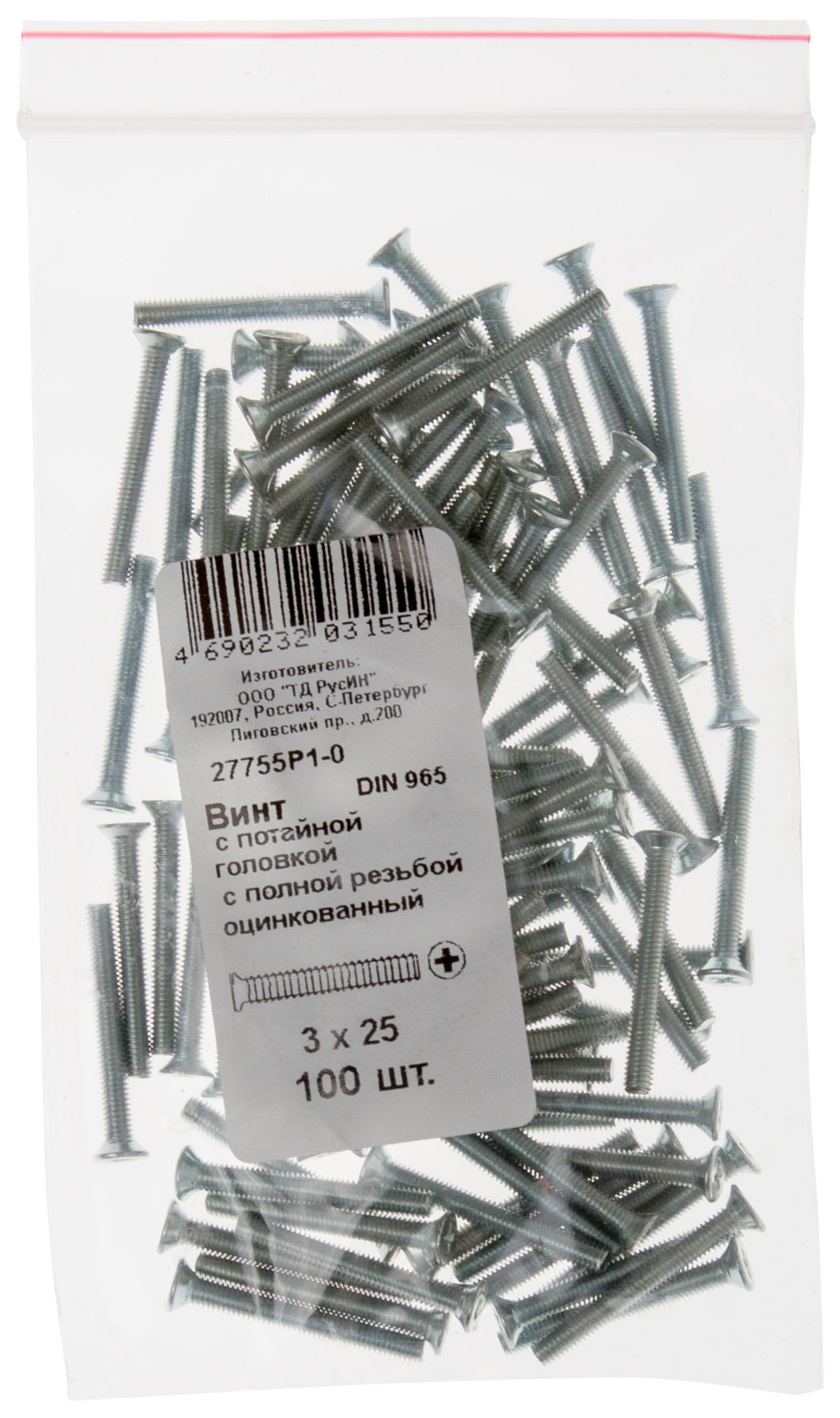 Винт с потайной головкой с полной резьбой оцинкованный DIN 965 5х60 100 шт Фасовка XВАТ арт. 27780-0 | код 787531