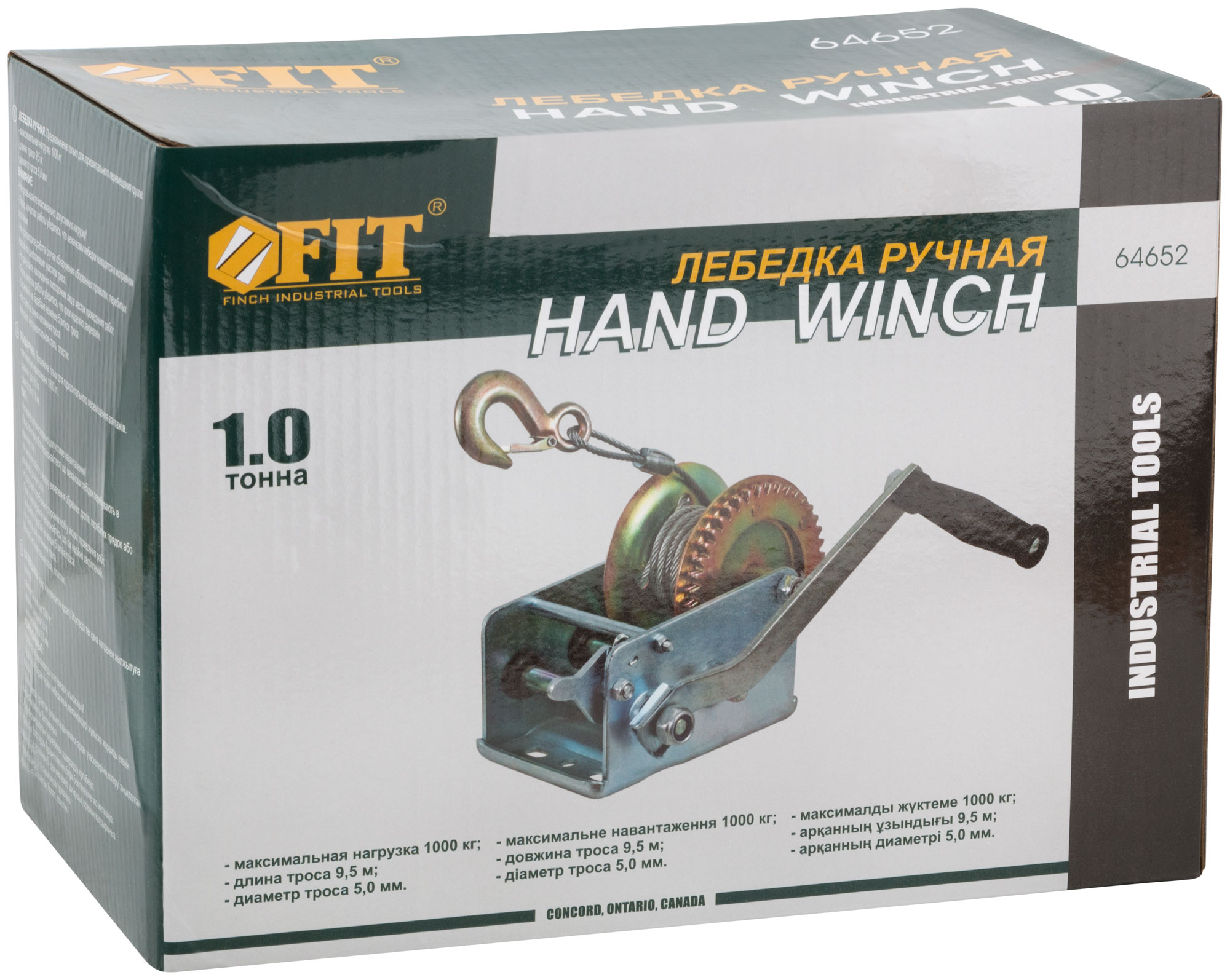 Лебедка шестеренчатая ( двойная шестеренка ), стальной трос 9,5 м х 5 мм, 1000 кг FIT FINCH INDUSTRIAL TOOLS арт. 64652 | код 788126
