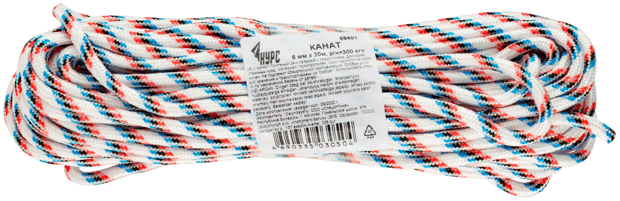 Канат полипропиленовый 24-х прядный с сердечником 6 мм х 20 м, р/н= 300 кгс КУРС арт. 68401 | код 788408