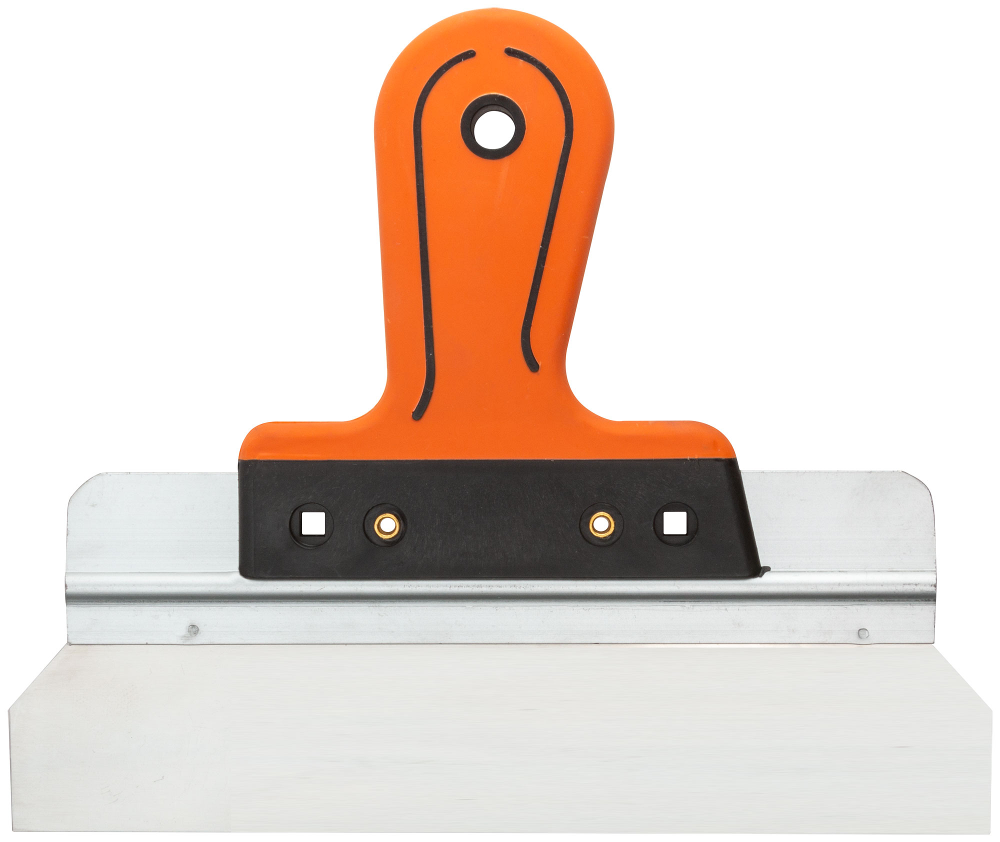 Фасадный шпатель из нержавеющей стали для штукатурных работ. Алюминиевая основа, эргономичная 2-К ручка. Материал: нержавеющая сталь, прорезиненная ручка.