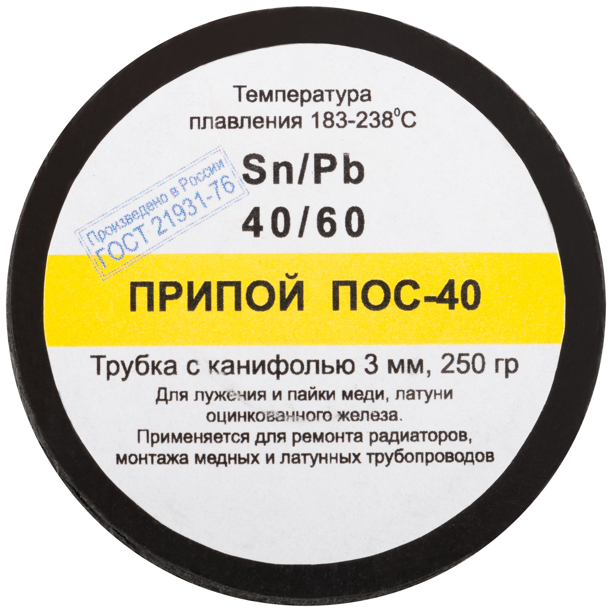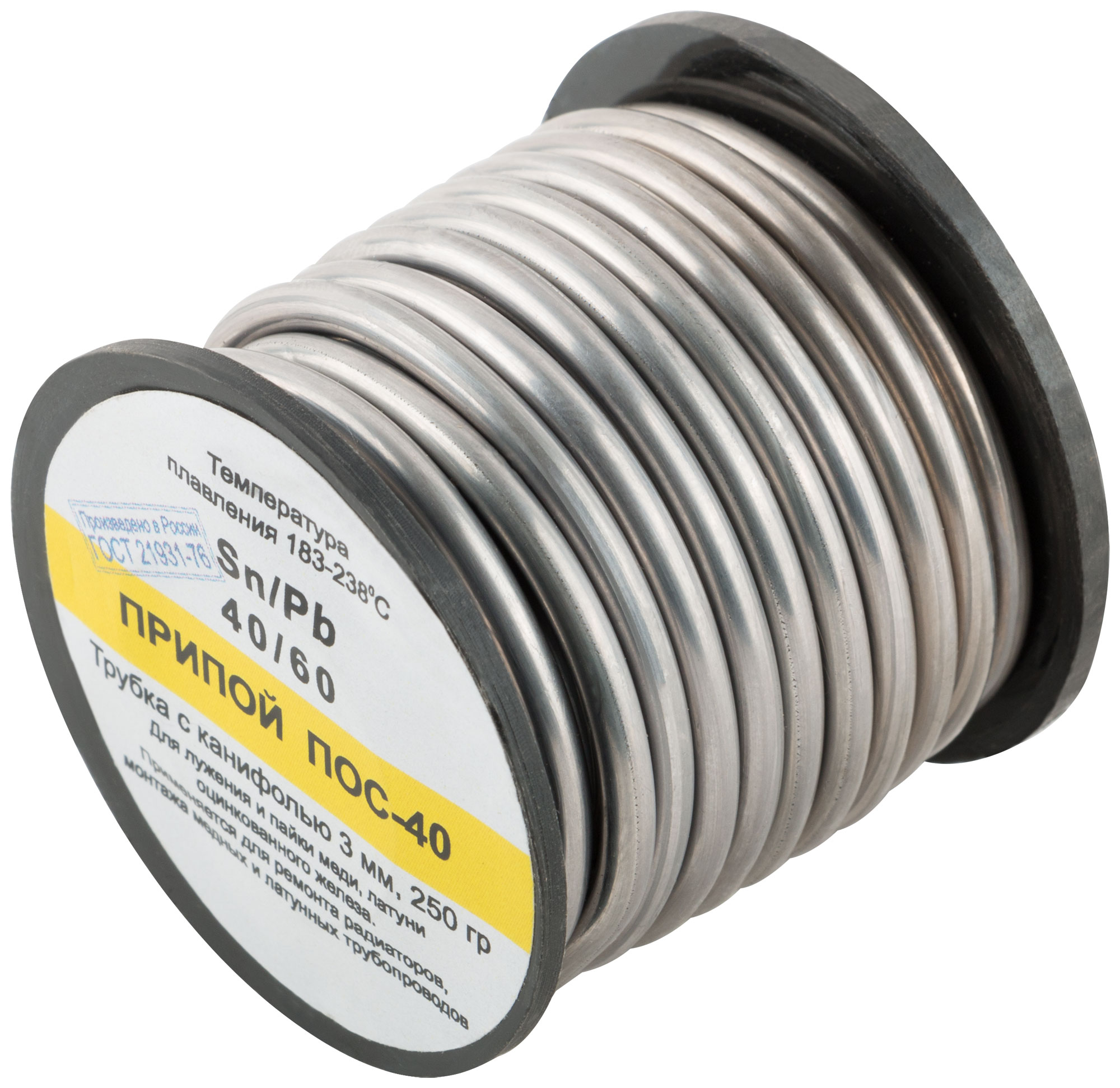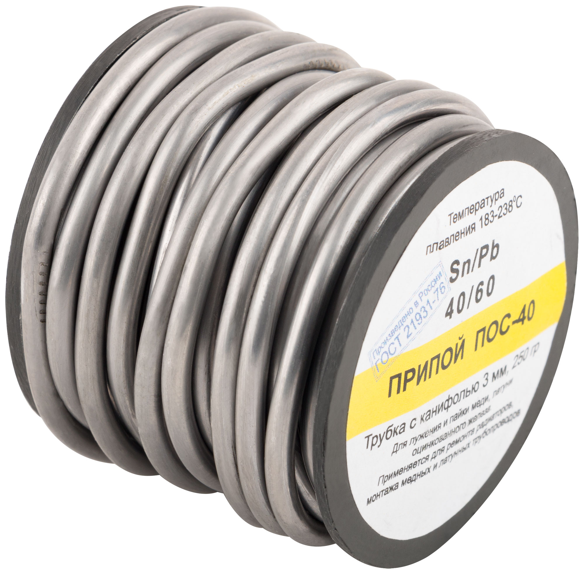 На катушке. Для лужения и пайки меди, латуни, оцинкованного железа. Применяется для ремонта радиаторов, монтажа медных и латунных трубопроводов, ремонта электроаппаратуры. Температура плавления 183 - 238 °C.