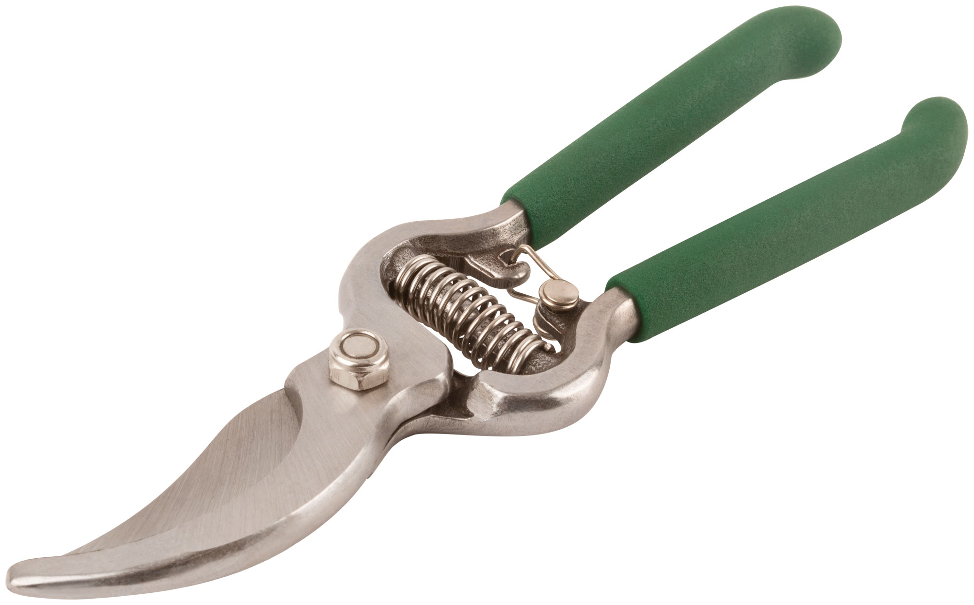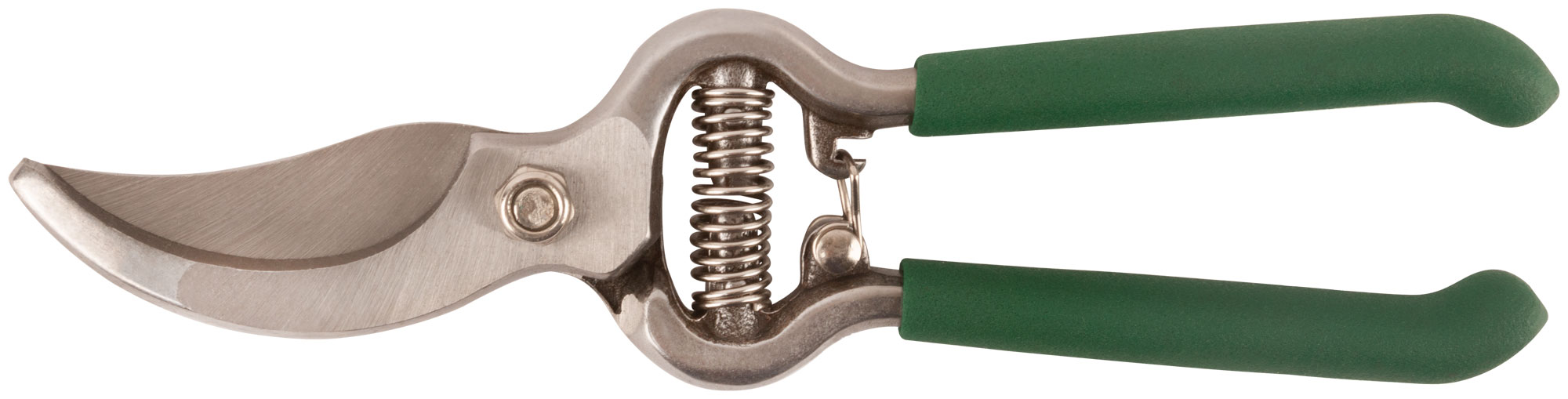 Цельнокованый. Усиленная пружина, режущие кромки внахлест. Для обрезания побегов и веток толщиной до 25 мм. Материал: лезвие из инструментальной стали, ПВХ покрытие ручек. Упаковка: блистер.
